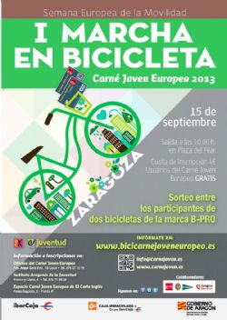 Se trata de una cicloturista, no competitiva, sin riesgo ni dificultad. Se ha establecido un recorrido de 15 km por las calles de Zaragoza, dirigida a todos los públicos. Sorteo entre los participantes de dos bicicletas de la marca B-PRO. Fecha: 15/09/2013 Hora: 10:00 horas |