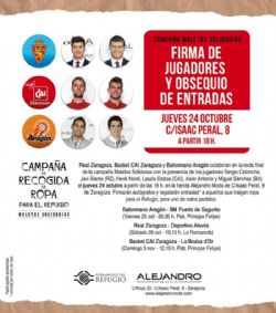 Este jueves 24 de octubre, acércate a la tienda de Alejandro Moda (C/ Isaac Peral) con una bolsa de ropa que ya no uses y consigue una entrada para ver al Real Zaragoza, CAI Zaragoza o Balonmano Aragón, que te entregarán varios jugadores de esos equipos. |