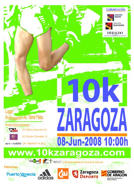 [29/04/2008] La A.D. Ciempiés Atletismo celebra la tercera edición de la 10k Zaragoza el 8 de Junio de 2008, una semana antes de la cita internacional Expo. Con este cambio de fecha, se busca alojar definitivamente la prueba atlética en el calendario Aragonés.