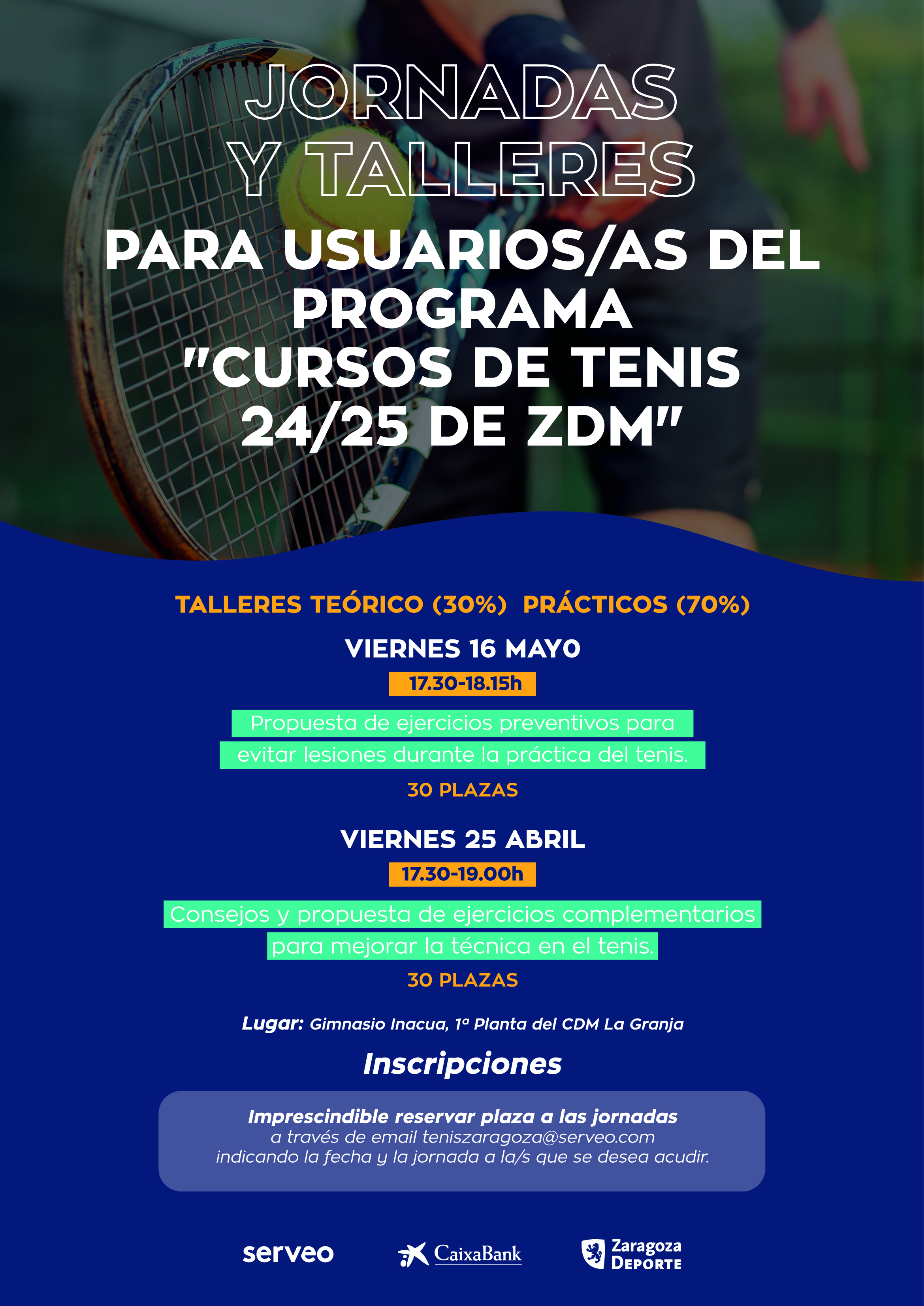 | Tendrán lugar los días 25 de abril (técnicas de mejora) y 16 de mayo (prevención de lesiones) en el CDM «La Granja». Exclusivos para los cursillistas de tenis, para participar es imprescindible reservar plaza previamente. |