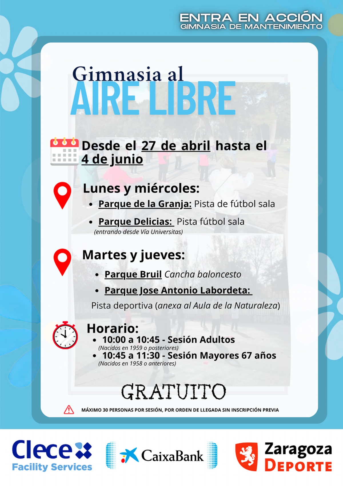 Cada día, de lunes a jueves, se ofrecerá la actividad en dos parques con dos clases en cada parque: la primera de 10:00 a 10:45, dirigida a usuarios en edad adulta y la segunda de 10:45 a 11:30, dirigida al público senior.
